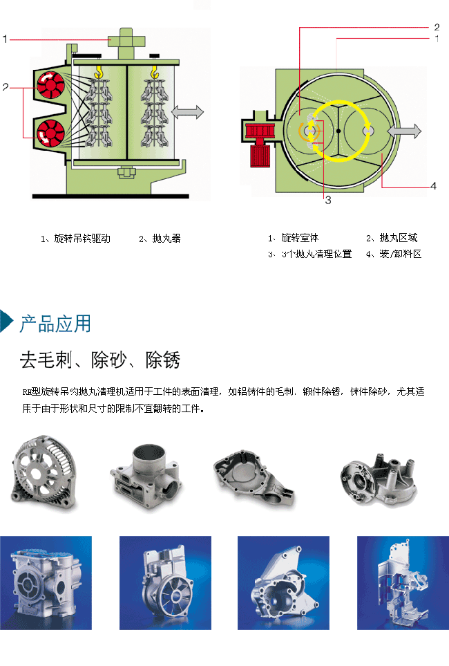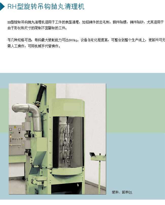 設計和操作順序 設備無需地基,室體主要由旋轉的拋丸室組成,拋丸室又分隔為兩部分,拋丸單元和丸料清除單元。每個分隔單元裝有旋轉吊鉤,吊鉤上懸掛被清理的工件。設備裝料的區域是敞開的,這樣,當工件在一側室體被拋丸清理時,可以在另一側室體卸料和裝料。無論室體旋轉到下一任何位置時,只要室體停止旋轉,丸料流立即被切斷。連續旋轉的吊鉤,可以在拋頭前針對每個拋丸周期,標識3個不同的位置,以避免拋丸死角。丸料經過分離單元去除雜質重新喂到拋丸器里。